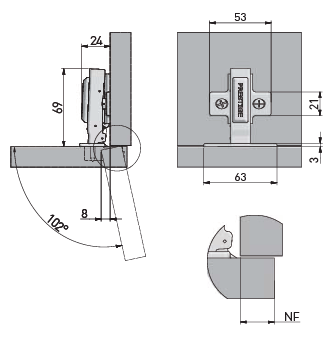1 Automatikscharnier für Außenseiten 110°, Kröpfung 0mm mit integrierter