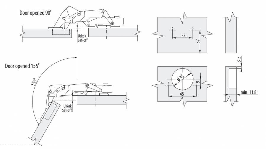 1 Automatikscharnier 155° Öffnungswinkel mit Schließautomatik und Aufklipstechnik