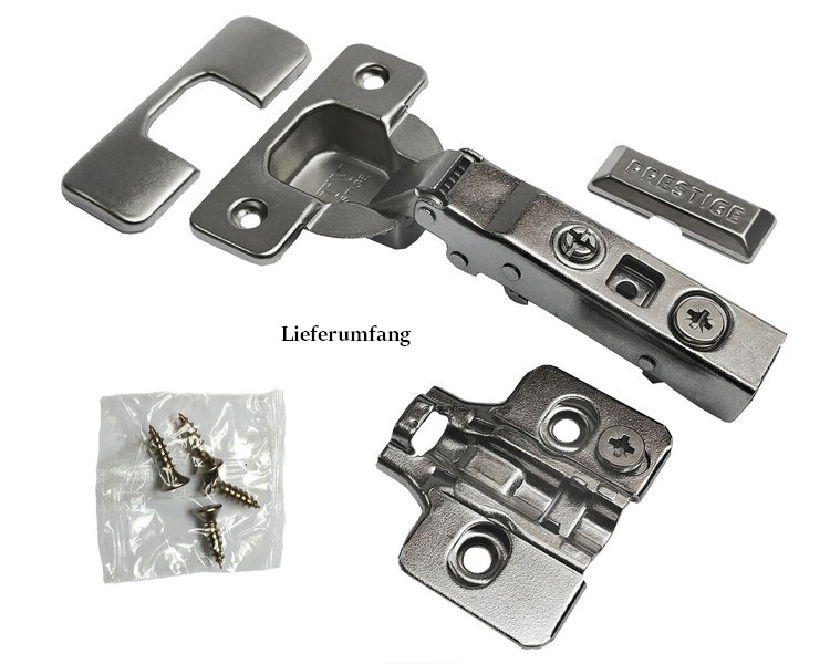 Das Scharnier ist geeignet für Fronten von 16 bis 18 mm Stärke, Topfdurchmesser 35 mm, erhältlich mit Montageplatte H=0 und die Befestigungsschrauben.