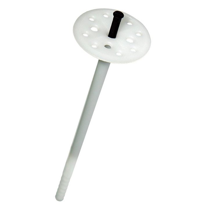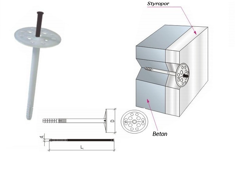 Der Dämmstoffhalter ist geeignet zur Befestigung von Dämmstoffen an Außenwänden und Mauern. Der Dübel ist aus schlagfestem Polypropylen und der Nagel (Spreizbolzen) aus schlagfesten Polypropylen, glasfaserverstärkt.