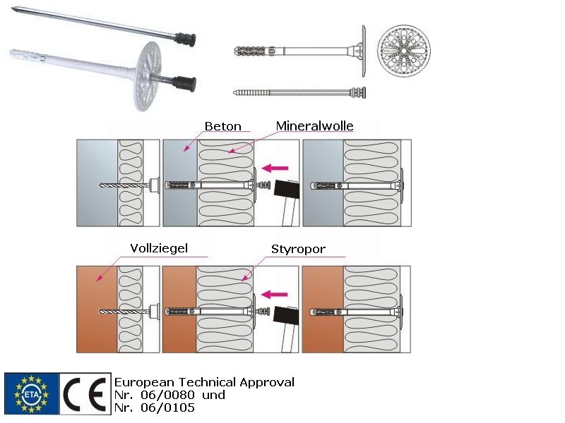 Zur Befestigung von Dämmstoffen z.B. Styropor, Holzwolleleichtbauplatten, Mineralwolle in Beton, Naturstein, Vollziegel, Kalksandvollstein, Druckfeste Steine und in allen sicheren Untergründen.