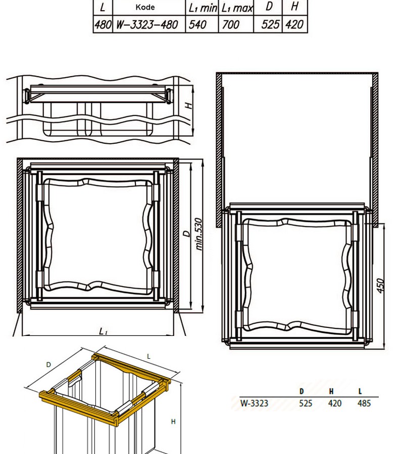 Einhängekorb, Wäschebehälter mit Ausziehrahmen 480mm breit.