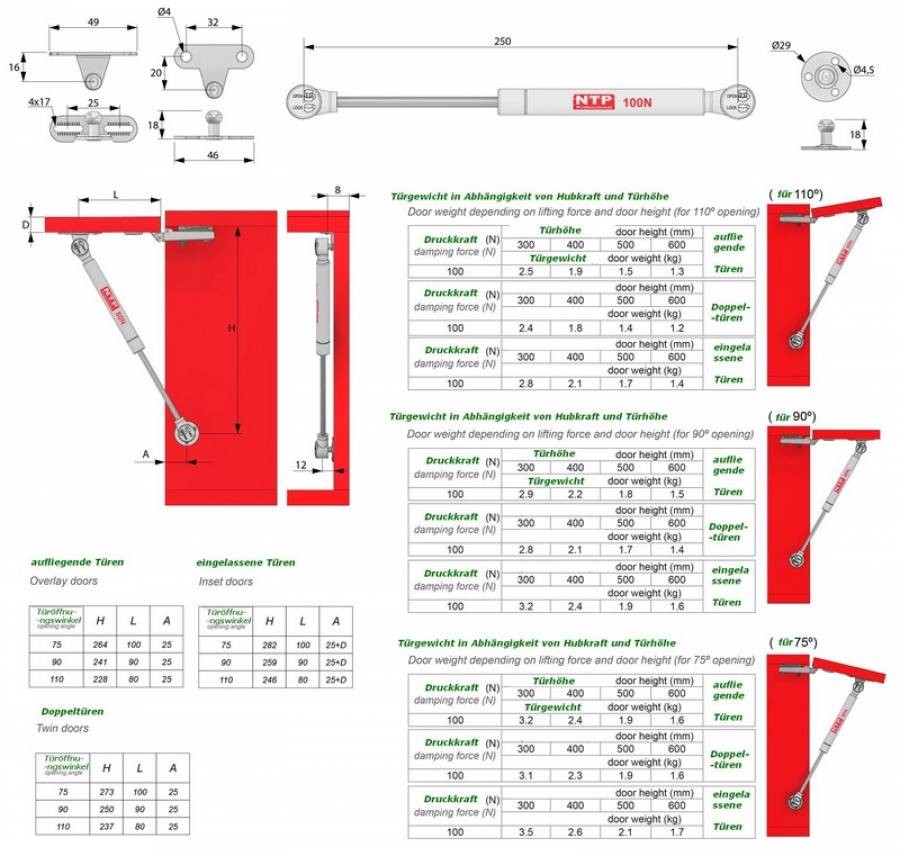 Die Federkraft (Druckkraft) ist abhängig vom Verhältnis zwischen Größe und Gewicht der jeweiligen Klappen, wählen Sie bitte die benötigte Federkraft aus unserer Richtwerttabelle für die max. Federkraft aus. Diese Gasdruckdämpfer sind sehr leicht zu montieren, wartungsfrei und optisch sehr ansprechend (weiße Farbe).