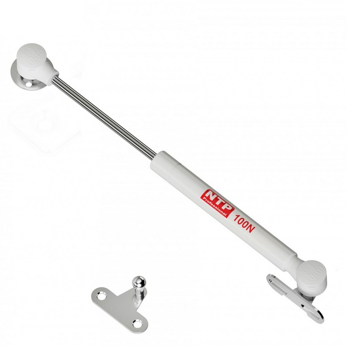 Der weiße Gasdruckdämpfer für Möbelklappen inkl. Befestigungsset und Schrauben mit 100N (Newton) Druckkraft (Federkraft, Stärke), für alle Klappen die horizontal geöffnet werden. Diese Gasdruckfeder hebt Klappen, hält sie offen und sorgt für ein leises und gedämpftes Schließen. Für Klappen aus Holz oder Aluminiumrahmen, Schulterklappen, Hauben, Türen, Wohnmobilschränke, Wohnwagenschränke mit einer Horizontalöffnung, selbstöffnend.