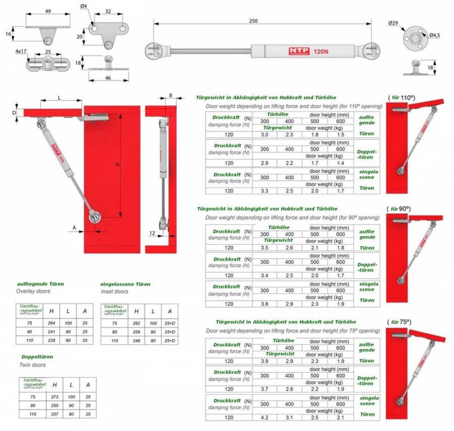 Die Federkraft (Druckkraft) ist abhängig vom Verhältnis zwischen Größe und Gewicht der jeweiligen Klappen, wählen Sie bitte die benötigte Federkraft aus unserer Richtwerttabelle für die max. Federkraft aus. Diese Gasdruckdämpfer sind sehr leicht zu montieren, wartungsfrei und optisch sehr ansprechend (weiße Farbe).