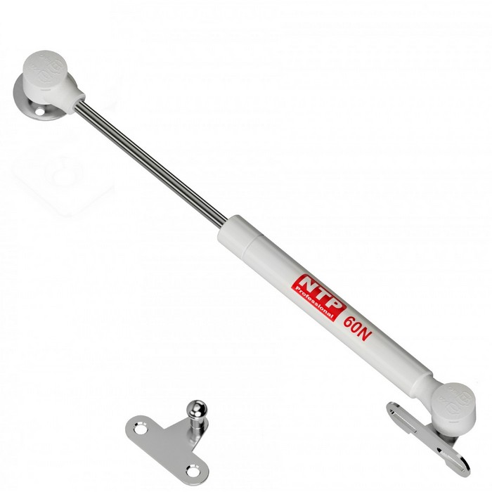 Der weiße Gasdruckdämpfer für Möbelklappen inkl. Befestigungsset und Schrauben mit 60N (Newton) Druckkraft (Federkraft, Stärke), für alle Klappen die horizontal geöffnet werden. Diese Gasdruckfeder hebt Klappen, hält sie offen und sorgt für ein leises und gedämpftes Schließen. Für Klappen aus Holz oder Aluminiumrahmen, Schulterklappen, Hauben, Türen, Wohnmobilschränke, Wohnwagenschränke mit einer Horizontalöffnung,selbstöffnend.
