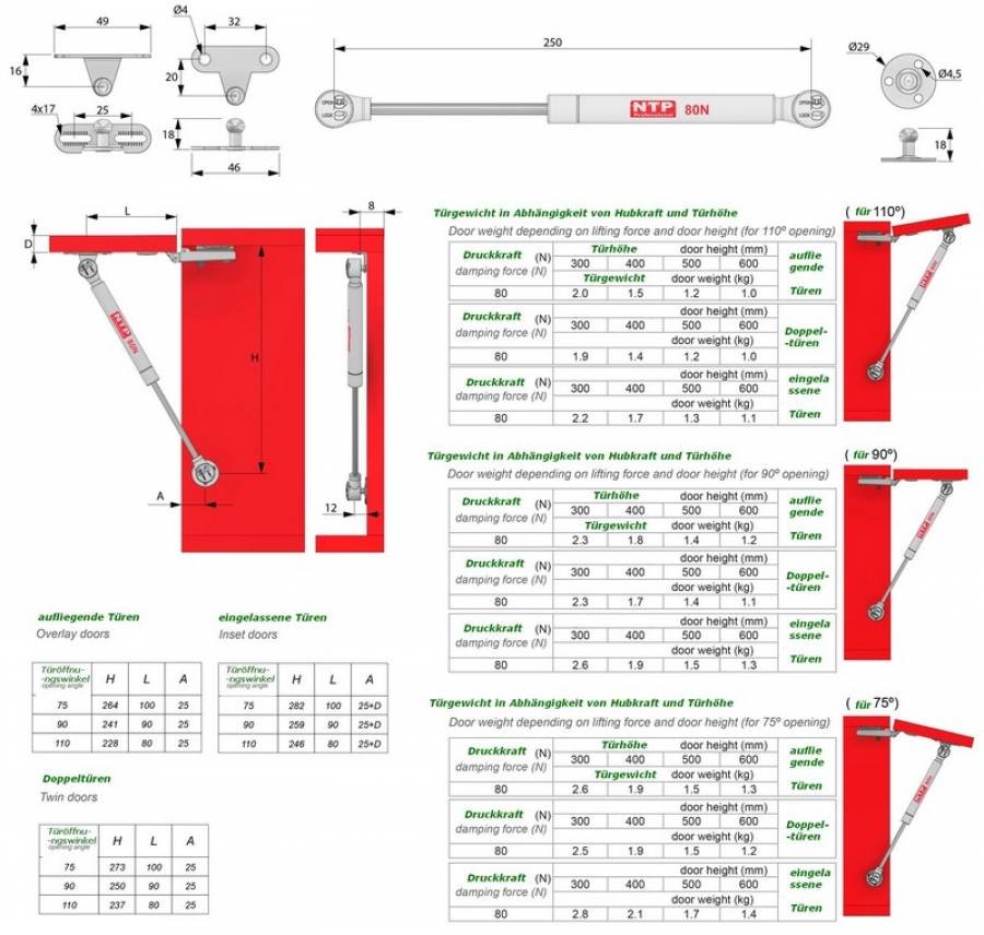 Die Federkraft (Druckkraft) ist abhängig vom Verhältnis zwischen Größe und Gewicht der jeweiligen Klappen, wählen Sie bitte die benötigte Federkraft aus unserer Richtwerttabelle für die max. Federkraft aus. Diese Gasdruckdämpfer sind sehr leicht zu montieren, wartungsfrei und optisch sehr ansprechend (weiße Farbe).