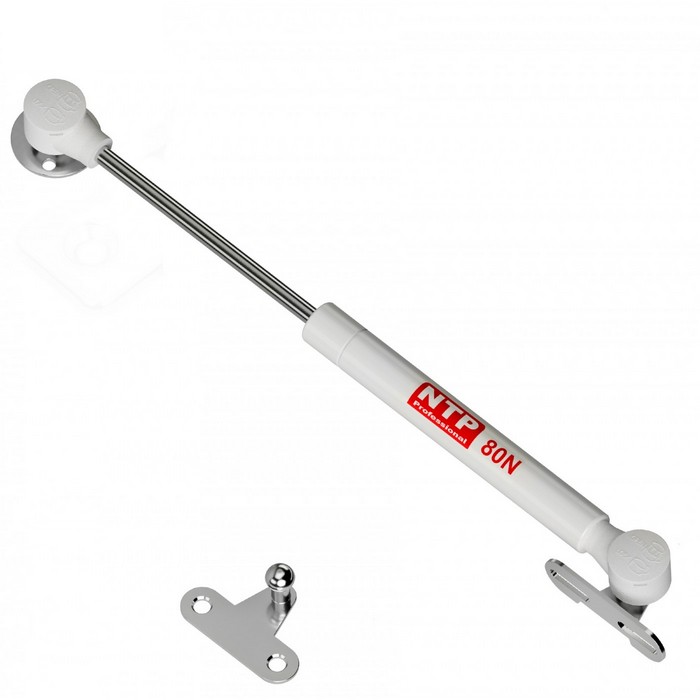 Der weiße Gasdruckdämpfer für Möbelklappen inkl. Befestigungsset und Schrauben mit 80N (Newton) Druckkraft (Federkraft, Stärke), für alle Klappen die horizontal geöffnet werden. Diese Gasdruckfeder hebt Klappen, hält sie offen und sorgt für ein leises und gedämpftes Schließen. Für Klappen aus Holz oder Aluminiumrahmen, Schulterklappen, Hauben, Türen, Wohnmobilschränke, Wohnwagenschränke mit einer Horizontalöffnung, selbstöffnend.