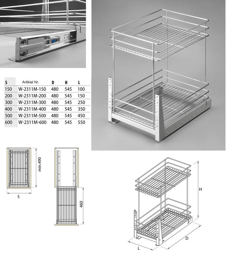 Schrankauszug / Korbschrankauszüge mit Frontauszugsystem - 2 Körbe - Schrankbreite 150mm - 600mm
