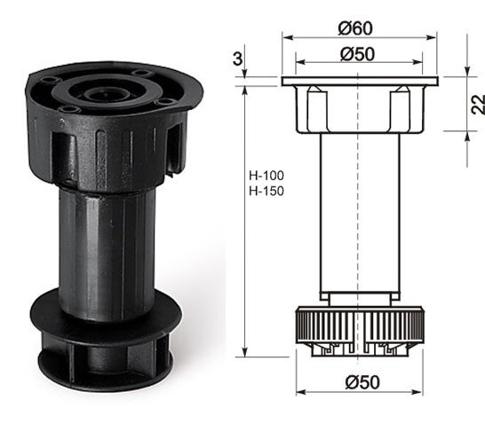 Kunststofffuß / Sockelverstellfuß schwarz Höhe 100 bis 150mm, drehbar,