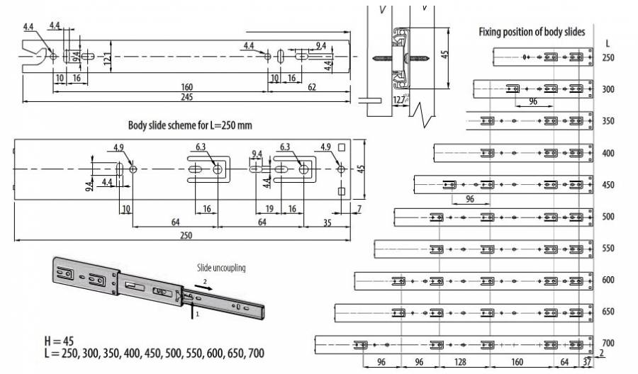 - Vollauszugführungen H-45 - ausgezeichnete Lösung für schwere Schubladen.