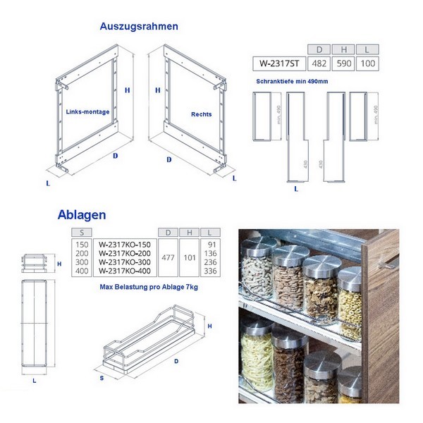 Universal Auszugrahmen für Korbschrankauszüge mit bis zum 4 Ablagen,