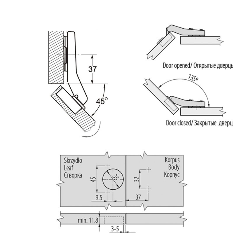Topfscharnier GTV für Eck- und Winkelschränke mit 45° Öffnungswinkel für